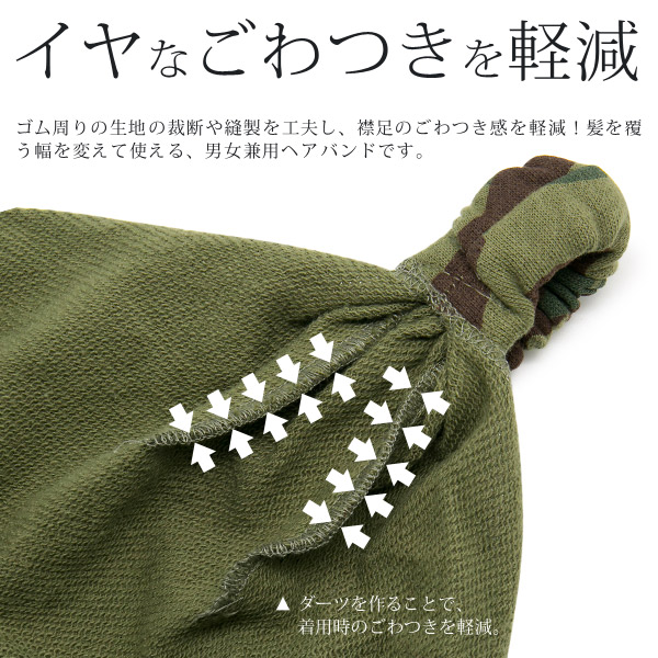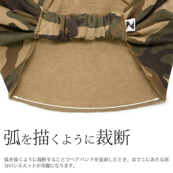 迷彩柄の綿100%スウェット生地を使用したZactionオリジナルのバンダナタイプのヘアバンドです。バンダナタイプのヘアバンドは、長方形に裁断し両端を束ねることで簡単に作ることも可能です。しかし、Zactionでは、裁断方法や縫製を工夫し、より頭にフィットした形状と被り心地にこだわりました。まず、おでこに当たる部分のシルエットが奇麗になるように直線ではなく弧を描くように裁断し、さらに、着けた時のごわつきを軽減させるために、ダーツをつくり頭にフィットしやすくしています。頭の後ろにくる部分には、ゴムを通しているので伸縮性があり着脱も楽におこなえます。