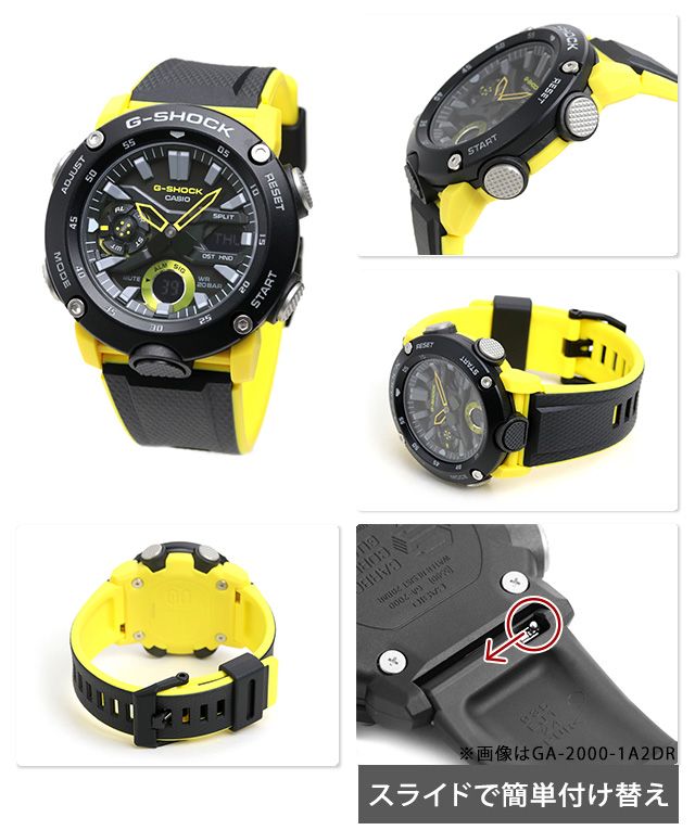 7年保証キャンペーン カシオ gショック ジーショック G-SHOCK ベーシック GA-2000シリーズ ワールドタイム クオーツ メンズ 腕時計 ブランド GA-2000-1A9DR CASIO BASIC 2000 アナデジ ブラック イエロー 究極の強さを求めて進化を続けるタフネスウォッチG-SHOCKから 耐衝撃構造として[カーボンコアガード構造]を採用したシリーズが登場。ケース素材に 軽量ながら樹脂の概念を越える高剛性を発揮するカーボン繊維入りファインレジンを使用。衝撃による破損 変形を防ぐことで 内部に配置したモジュールを保護します。更に 裏蓋を二重構造とすることで 裏面への衝撃もガード。ボタン構造の耐衝撃化により ボタンガードのない外装デザインも同時に実現しました。デザイン面では 立体文字板や大型フロントボタンなどを大胆に配置。力強い表情を醸し出すタフネスデザインに仕上げましたまた スライド式のバンドを採用し 簡単なワンタッチ操作でバンドの取り外しが可能。バンド交換によるカスタマイズ(別売り)にも対応しています。国内モデル品番:GA-2000-1A9JF