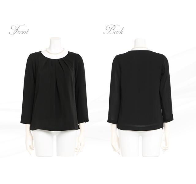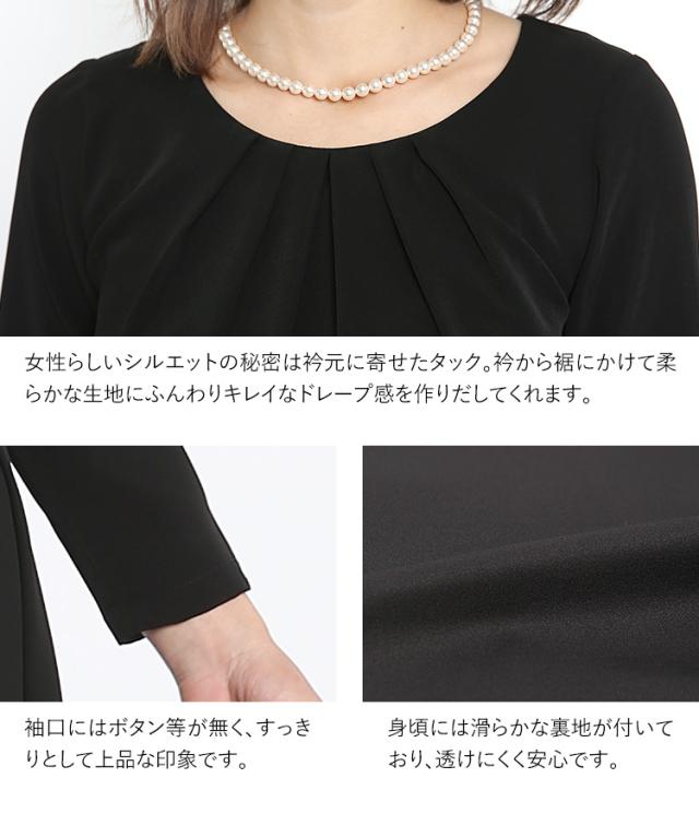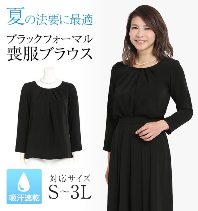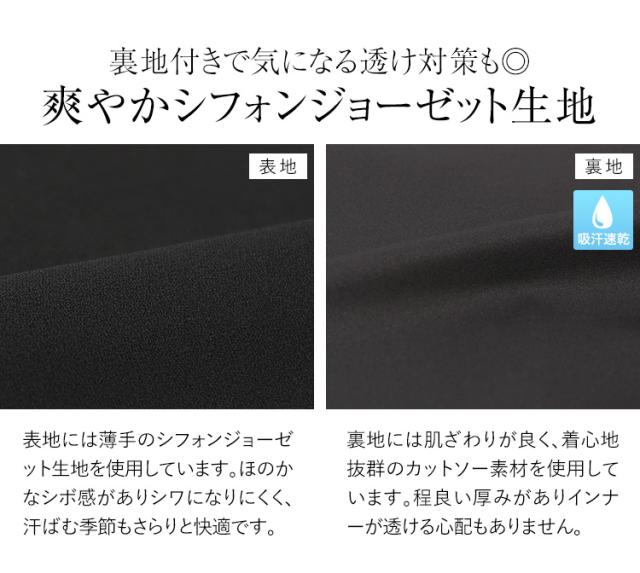 夏の法事・法要に喪服として着用できる「深い黒」の生地を使用し、露出を抑えた上品なフォーマルブラウスです。裏地には吸汗性・通気性の良い素材を使用しており快適にお過ごしいただけます。表地には薄手のシフォンジョーゼット生地を使用しています。ほのかなシボ感がありシワになりにくく、汗ばむ季節もさらりと快適です。