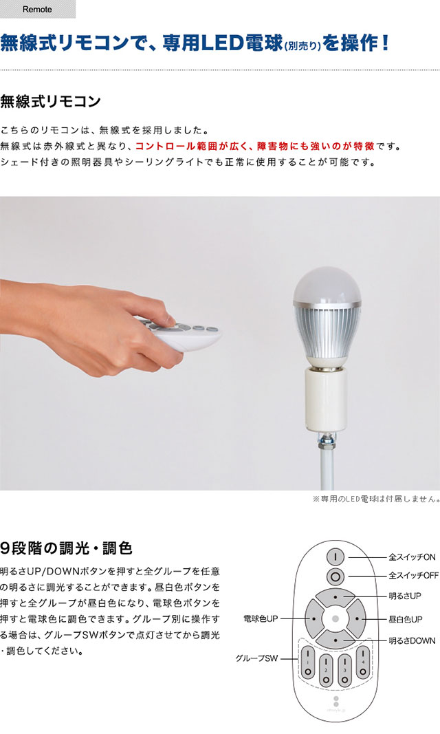 こちらの商品は、リモコンのみの販売となります。専用のLED電球は付属しませんので、ご購入の際はご注意ください。
