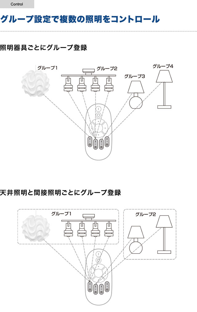 電球を交換するだけで簡単にリモコン化!画期的なLED電球が登場!新しく照明器具を買い替えなくても、普段お使いの照明器具の電球を交換するだけで、専用リモコン(オプション)でON・OFFから、調光・調色、常夜灯までコントロールすることができます。そして、リモコンにはグループ設定機能がついているので、複数の照明器具を一つのリモコンでコントロールすることも可能です。