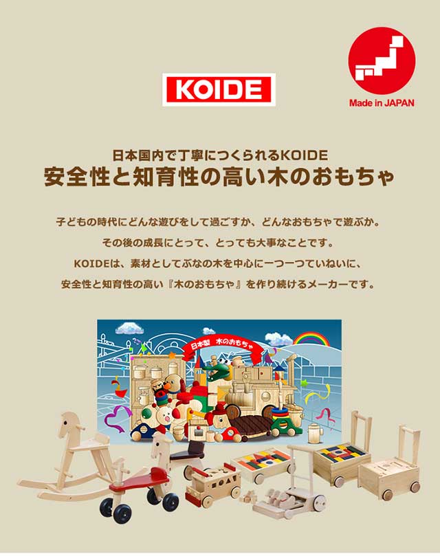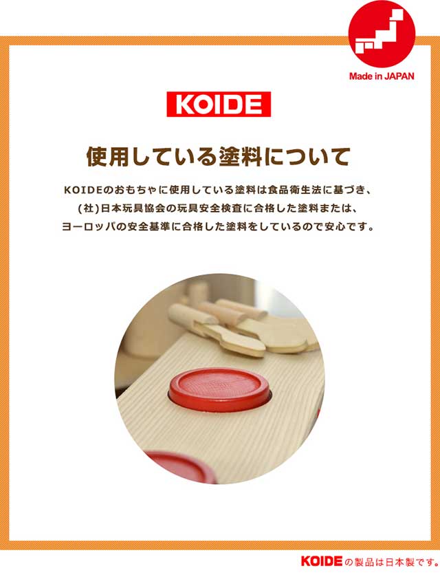 KOIDEのおもちゃで使用している木材はほとんどが『ぶなの木』。ぶなの木は、耐久性があり木肌が緻密でささくれが出にくいので安全です。お子様の手に触れる部分なので、ぶなの木で作ることにこだわりました。