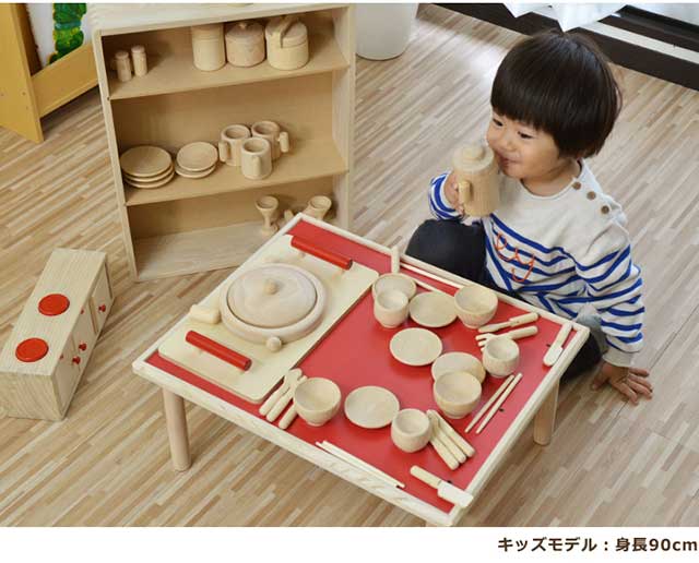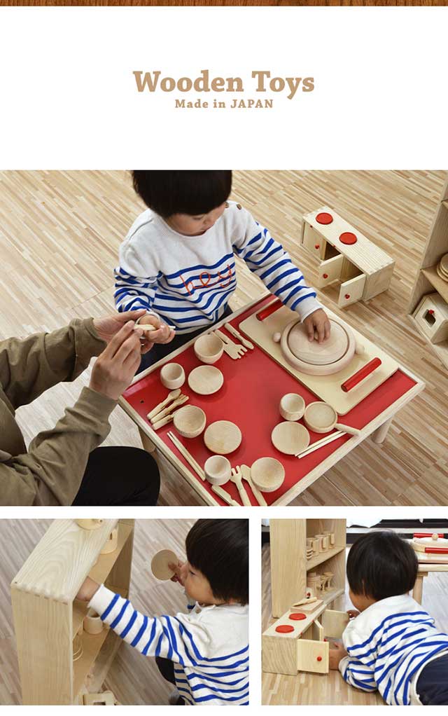 子どものあそびの定番、みんな大好きおままごとセットです。料理に必要な流し台やお鍋・フライパンはもちろんのこと、お皿やお箸、急須など小物もたくさん付属しています。食べることへの関心やお手伝いの気持ちを育むセットです。