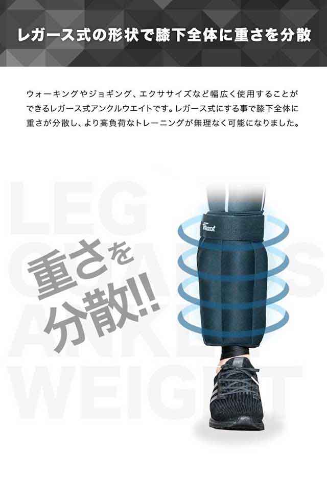 ウォーキングやジョギング、エクササイズなど幅広く使用することができるレガース式アンクルウエイトです。レガース式にする事で膝下全体に重さが分散し、より高負荷なトレーニングが無理なく可能になりました。