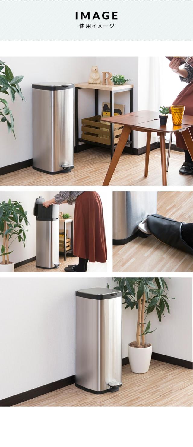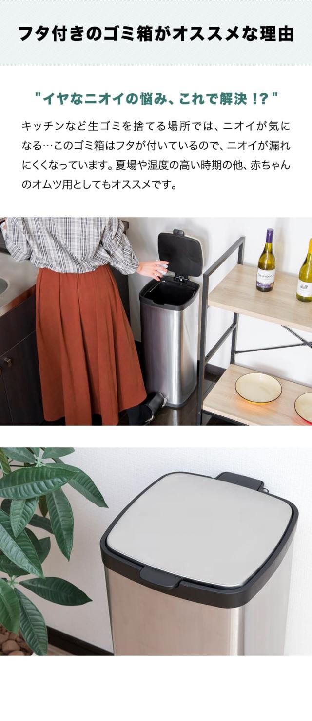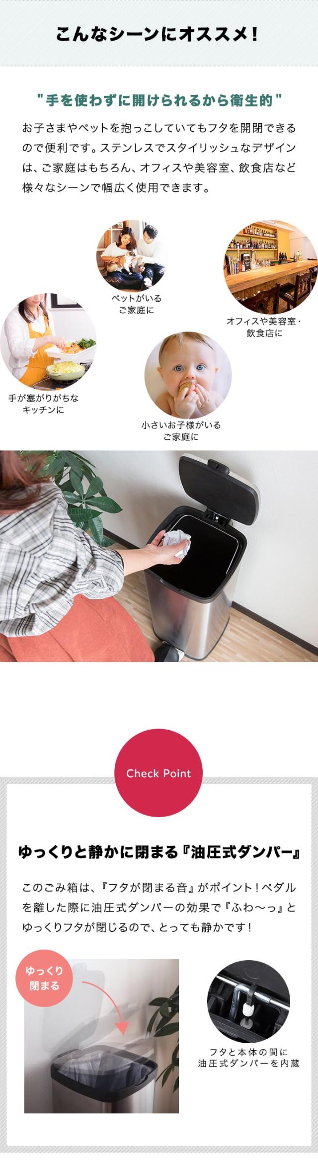 直接手を使わずにペダルを踏むだけで開ける事ができるので衛生的です。 小さいお子さまやペットを抱っこしている時にもフタを開閉できるので便利です。また、ステンレスでスタイリッシュなデザインなので、ご家庭での使用はもちろん、オフィスや美容室、飲食店など様々なシーンで幅広く使用できるゴミ箱です。