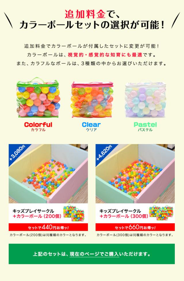 追加料金でカラーボールが付属したセットに変更が可能!カラーボールは、視覚的・感覚的な知育にも最適です。また、カラフルなボールは、3種類の中からお選びいただけます。
