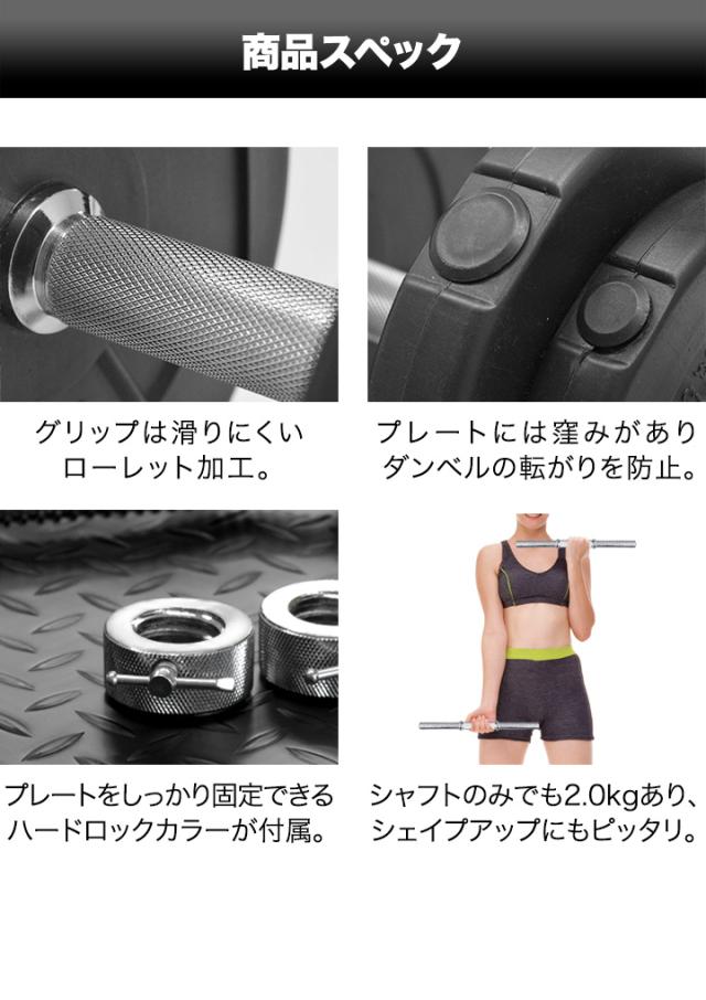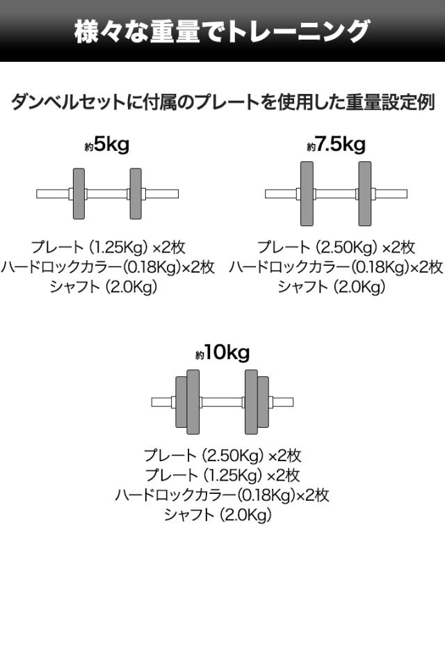 | セット内容: ・プレート2.5kg×4 ・プレート1.25kg×4 ・シャフト2.0kg×2 ・ハードロックカラー0.18kg×4 |