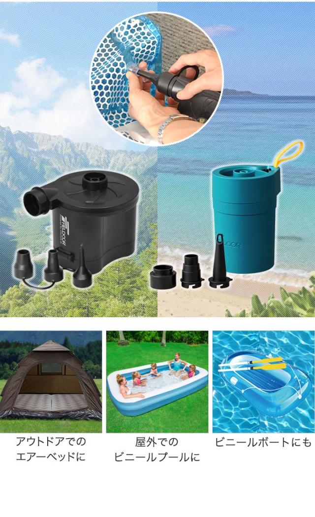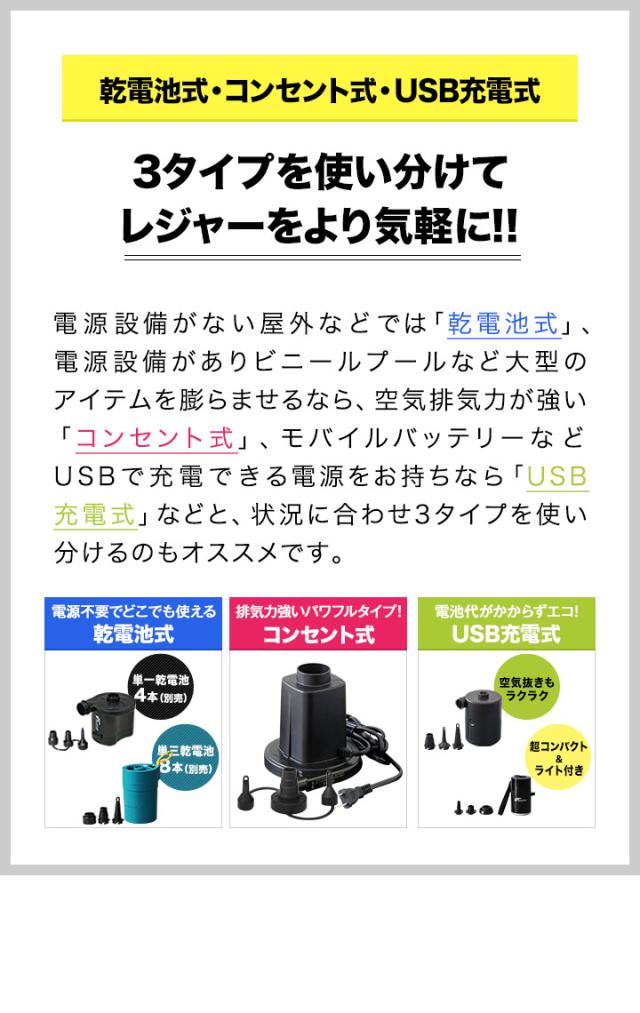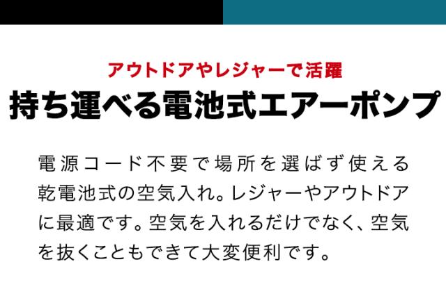 電源コード不要で場所を選ばず使える乾電池式の空気入れ。レジャーやアウトドアに最適です。空気を入れるだけでなく、空気を抜くこともできて大変便利です。
