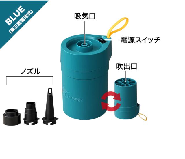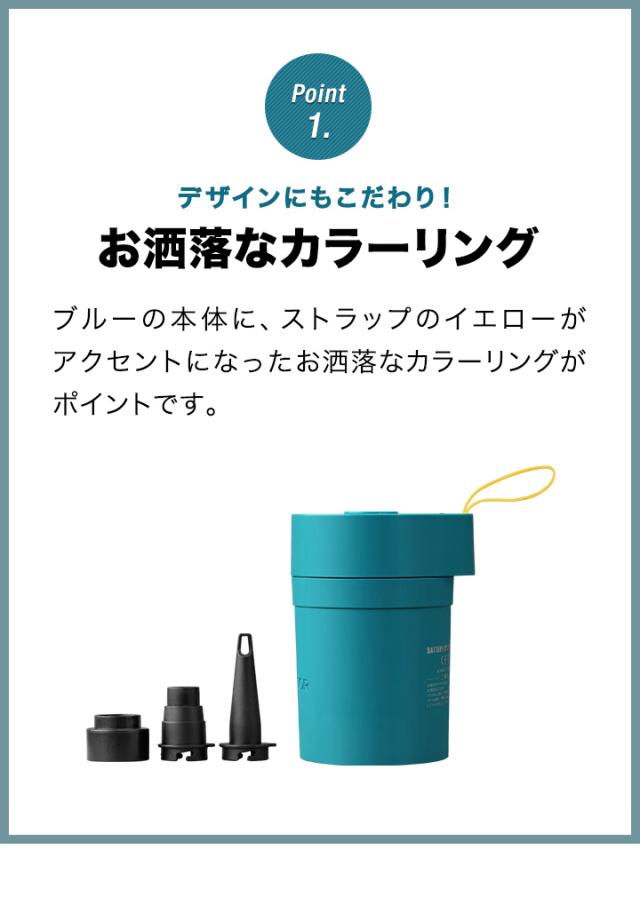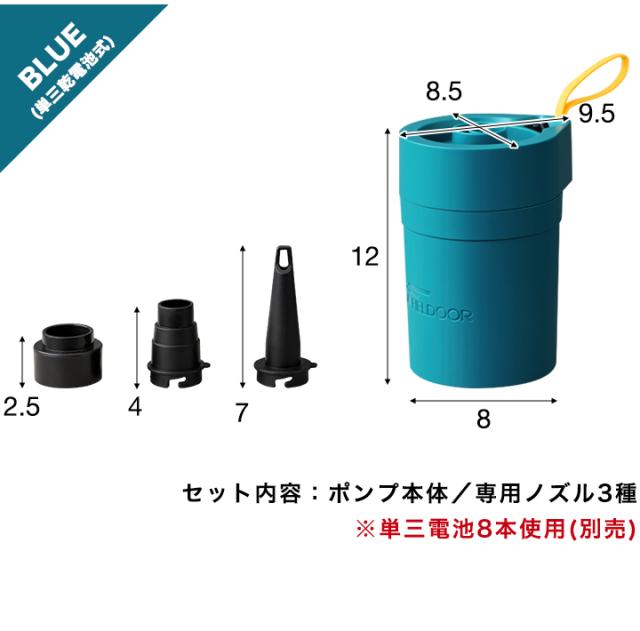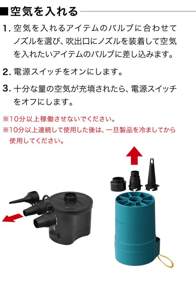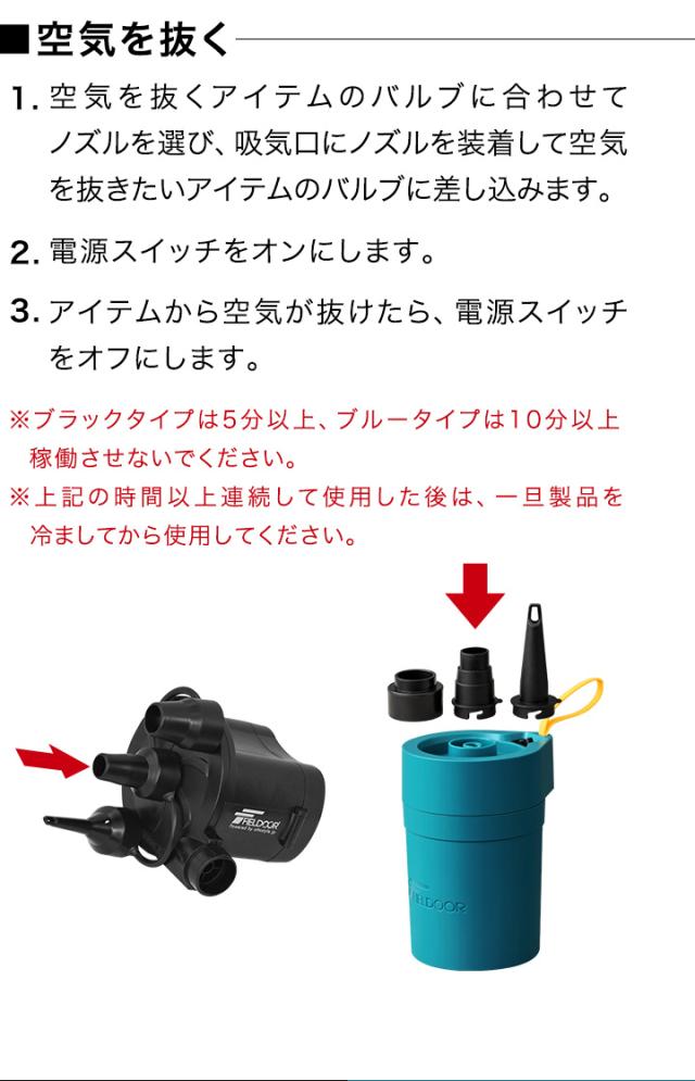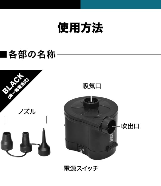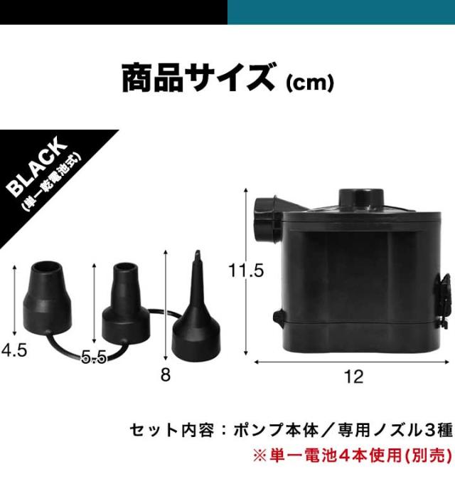 | 特記事項: ※商品に電池は付属しておりません。 ※空気を入れる場合10分以上、空気を抜く場合ブラックタイプは5分以上、ブルータイプは10分以上の連続運転はしないでください。 ※中国製の電池を使用すると直径が日本製の電池より大きいため故障の原因になります。日本製をご使用ください。 |