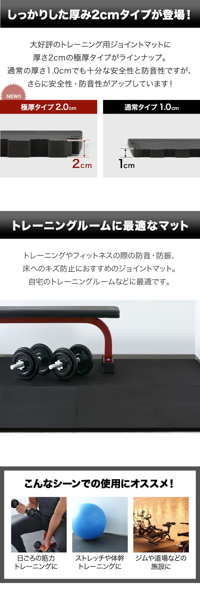 大好評のトレーニング用ジョイントマットに厚さ2cmの極厚タイプがラインナップ。通常の厚さ1.0cmでも十分な安全性と防音性はありましたが、今回の厚さ2.0cmの極厚タイプの登場により、さらに安全性・防音性がアップ!重量マシンを使用する際も防音・キズなどを気にせずトレーニングに集中できます。