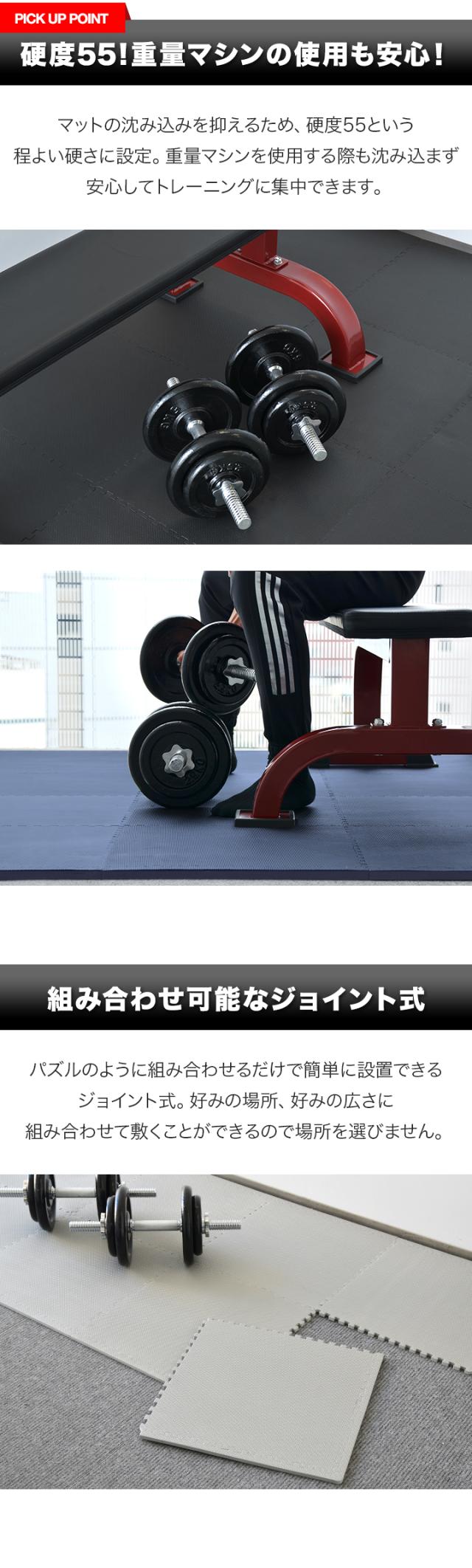このジョイントマットを触った時に硬いと感じる方もいると思います。硬い理由は、マットの沈み込みを抑えるため、硬度55という程よい硬さに設定。重量マシンを使用する時も沈み込まないので、安心してトレーニングに集中できます。