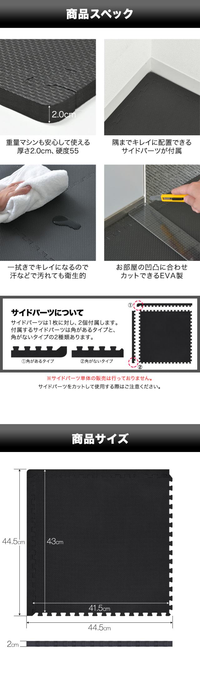 | 特記事項: ※2025年1月1日よりサイズを変更しました。 ※サイドパーツ単体の販売は行っておりません。サイドパーツをカットして使用する際はご注意ください。 ※長期間の使用など、ご使用の環境によって商品の色が床材の表面に色移りする場合がありますのでご注意ください。 ※EVA樹脂の臭いが最初はある程度しますが、人体には影響ありません。臭いによる返品はお受けできませんので、臭いの気になる方はその旨をご了承の上ご購入をお願いします。 |