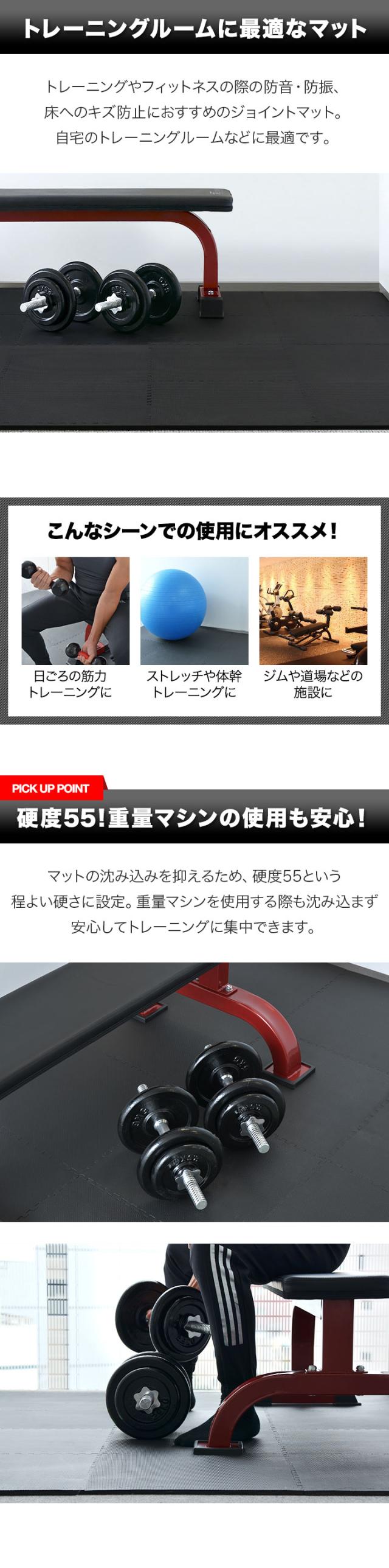 トレーニング時の防音・防振、床へのキズ防止に最適なジョイントマットです。ブラックカラーで格調高く、トレーニングルームにピッタリなデザイン。重量マシンを使用する際も、沈み込みを抑えた硬さで安心して使用することができます。トレーニング以外にも、フィットネスにもオススメなマットです。