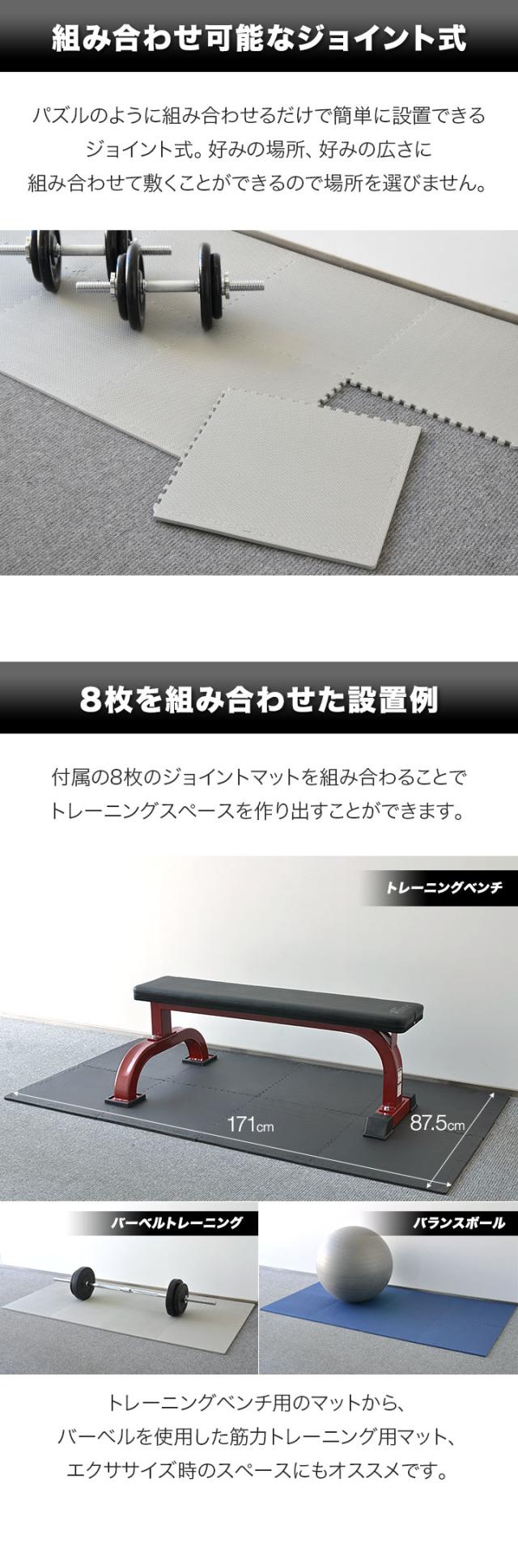 付属の8枚のジョイントマットを組み合わることで、トレーニングスペースが生まれます。トレーニングベンチ用のマットから、バーベルを使用した筋力トレーニング用マット、エクササイズや体幹トレーニング時のスペースにもオススメです。