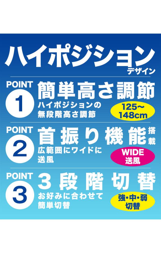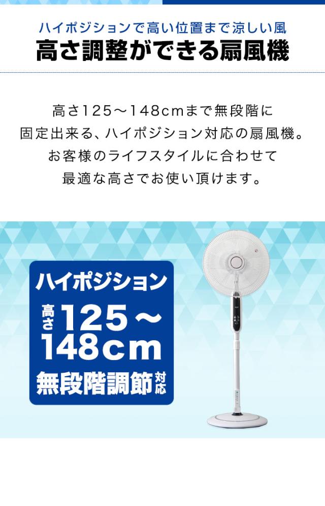 高さ125〜148cmまで無段階に 固定出来る、ハイポジション対応の扇風機。 お客様のライフスタイルに合わせて 最適な高さでお使い頂けます。