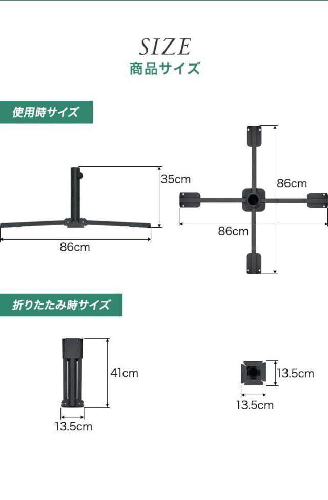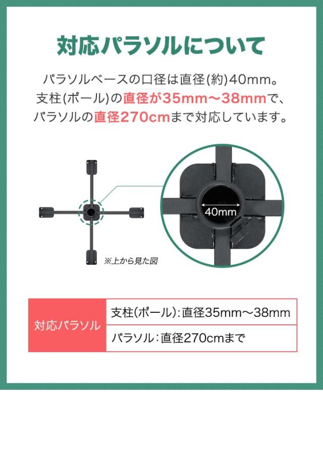 | 対応サイズ: 支柱径35mm〜38mm / パラソル直径270cmまで |
