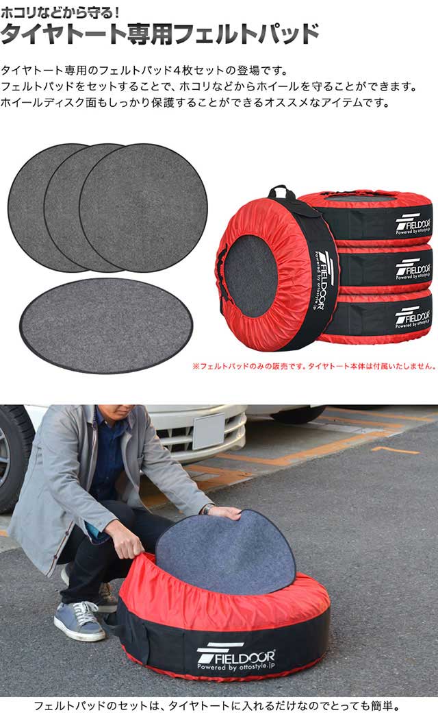| 特記事項 | ※こちらはタイヤトート専用のフェルトパッドです。タイヤトート本体は付属いたしません。 ※タイヤのサイズによっては、完全にホイールを保護しきれない場合がありますので、予めサイズをご確認の上、ご購入ください。 |