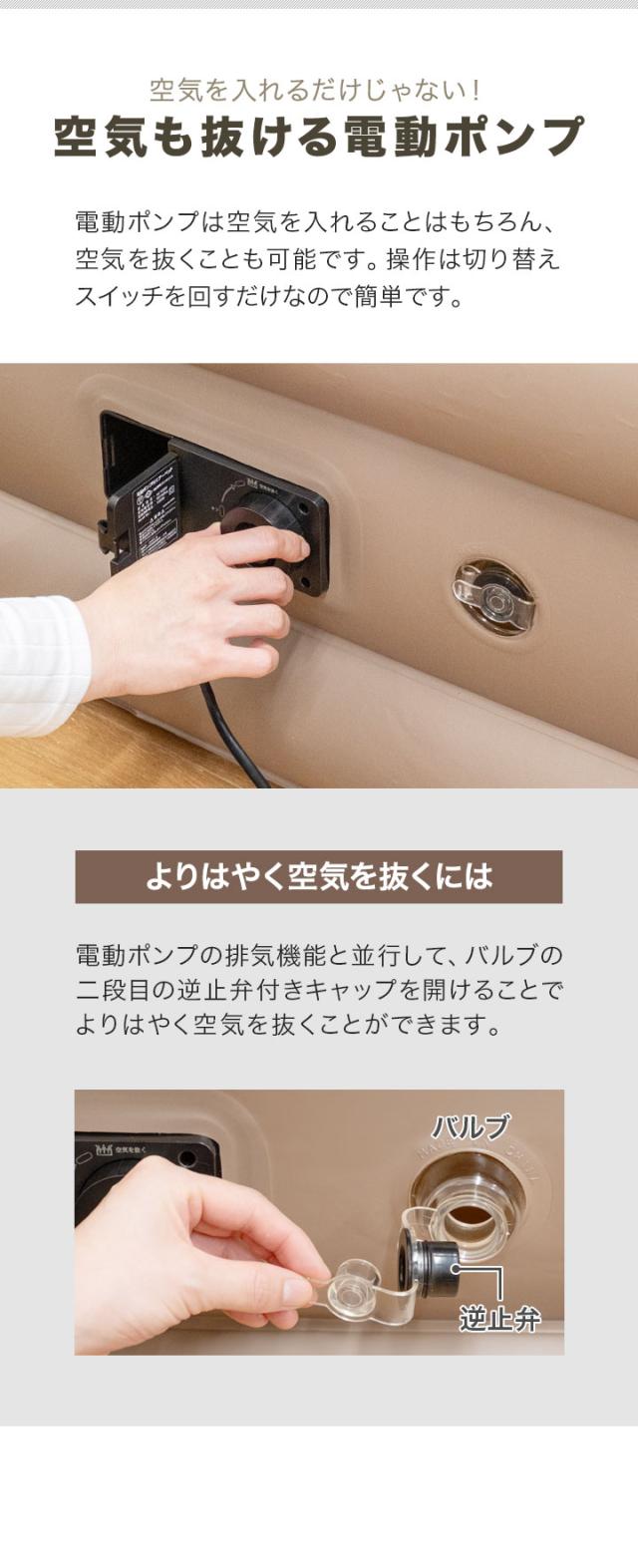 内蔵の電動ポンプは空気を入れることはもちろん、空気を抜くことも可能です。操作は切替スイッチを回すだけなので簡単です。