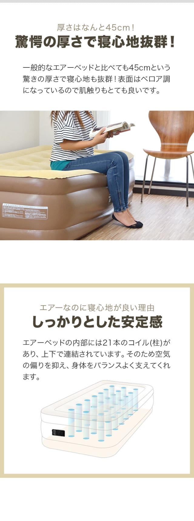 コンセント式電動ポンプが内蔵した厚さ45cmのエアーベッド。スイッチを回すだけで膨らみ、厚さ45cmと一般的なエアーベッドより厚いので寝心地も抜群!来客用の簡易ベッドとしても最適です。