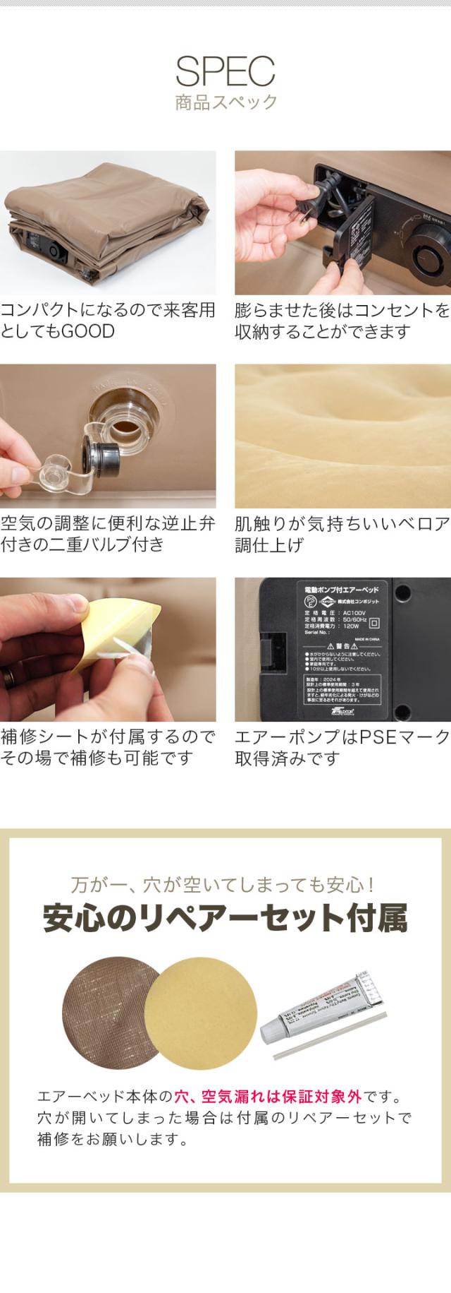 | 特記事項: ※本商品はPVC(ポリ塩化ビニール)を使用しております。材質の特性上、接触・摩擦による他製品への色移り、または本商品への色移りすることがありますのでご注意ください。 ※エアーベッド本体の穴、空気漏れは保証対象外です。穴が開いてしまった場合は付属のリペアーパッチセットで補修をお願いします。 PSマークの種類:PSE 届出事業者名:株式会社コンポジット |