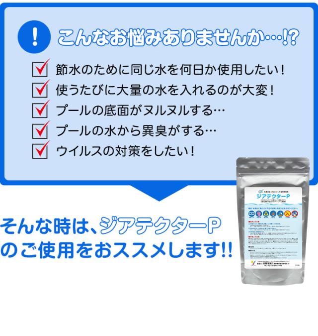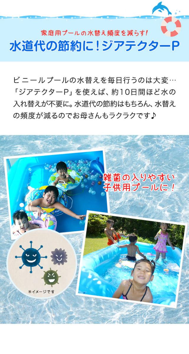 ビニールプールの水替えを毎日行うのは大変…「ジアテクターP」を使えば、約10日間ほど水の入れ替えが不要に。水道代の節約はもちろん、水替えの頻度が減るのでお母さんもラクラクです♪