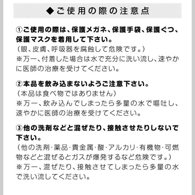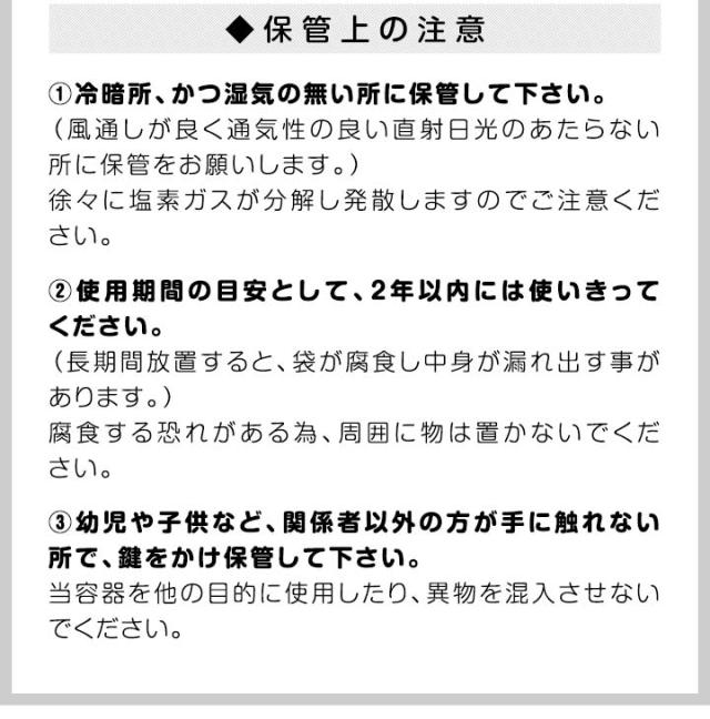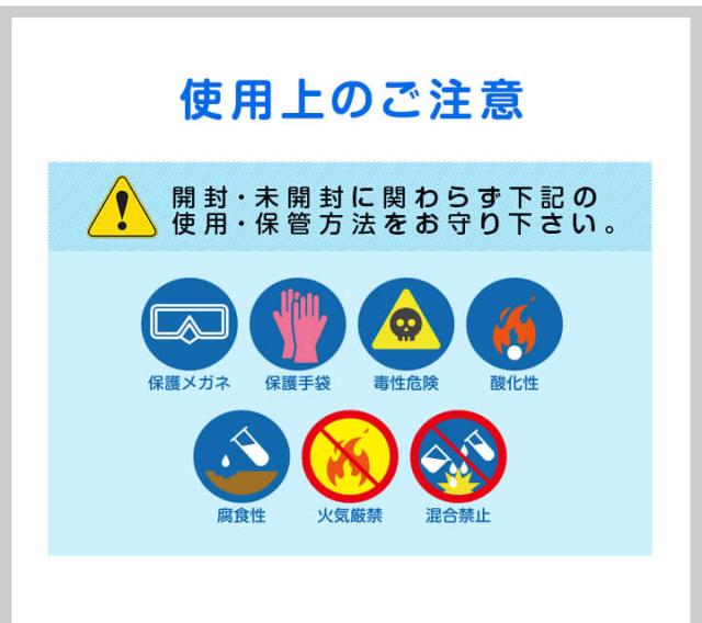 | 注意点 (次亜塩素酸水としてお使いの場合): ・決して、飲用はしないでください。 ・本製品を他の目的に使用したり、異物を混入させないでください。 ・ペットボトルで作成した場合、誤って飲まないようご注意下さい。 |