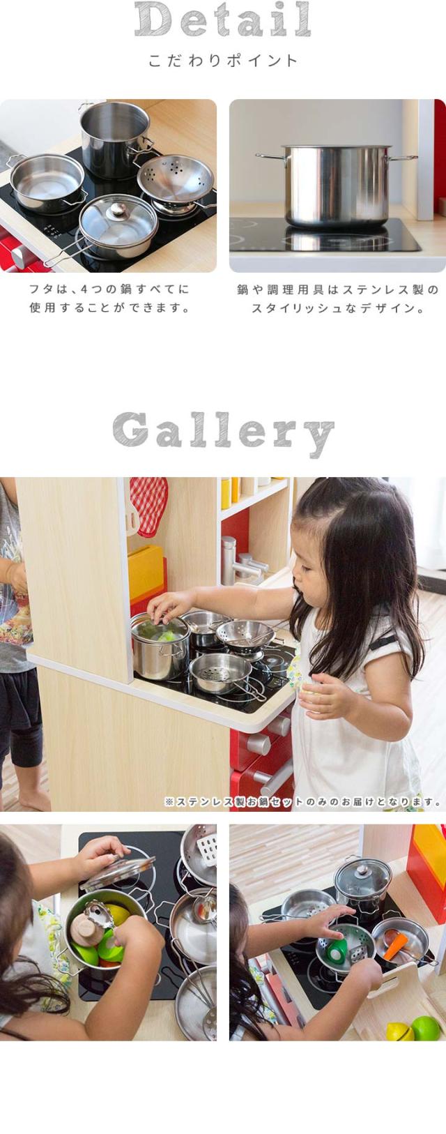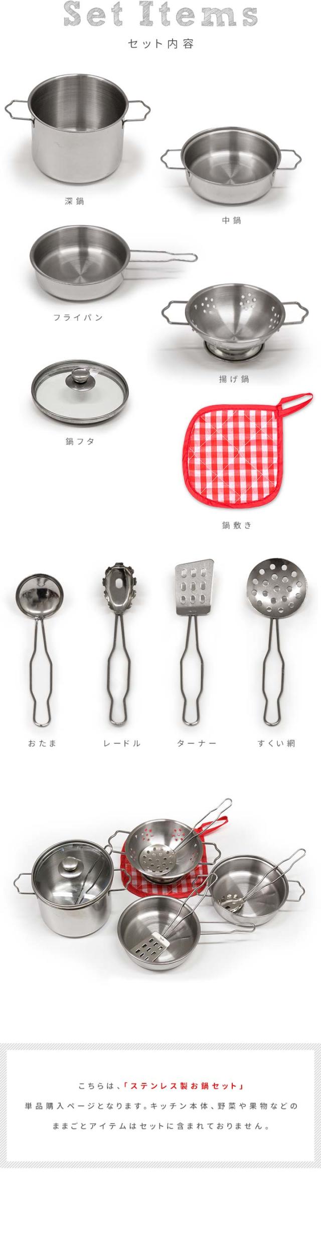 | 特記事項: こちらはステンレス製お鍋セット単品購入ページとなります。キッチン本体・野菜や果物などのままごとアイテムはセットに含まれておりません。 |