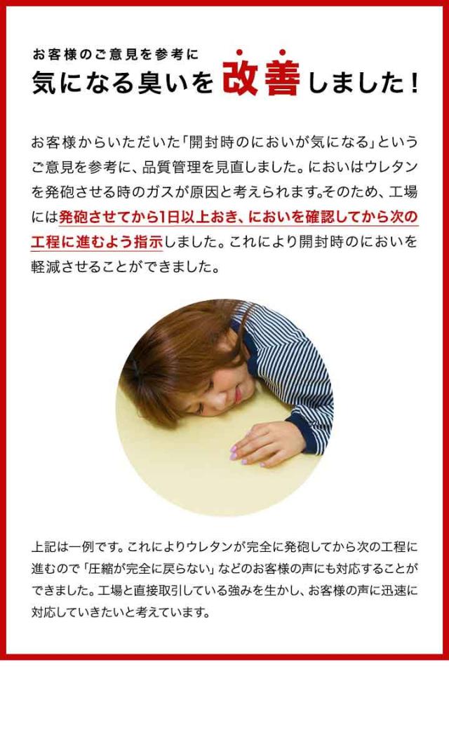 | 特記事項: ※圧縮梱包されたままの状態で長期間保管した場合、マットレスが復元できなくなってしまいます。商品到着後、1週間以内に必ず圧縮から開放をして頂くようにお願いします。 ※製品の臭いが気になりましたら、風通しの良いところで脱臭してください。この臭いは素材のウレタンによるもので無害です。臭いに敏感な方は十分ご検討の上、ご購入をお願いいたします。 ※マットの硬さは温度によって変わってきます。また、硬さの感じ方には個人差があります。 ※カバーは取り外して洗濯ができますが、マットレス本体は洗濯しないでください。 |