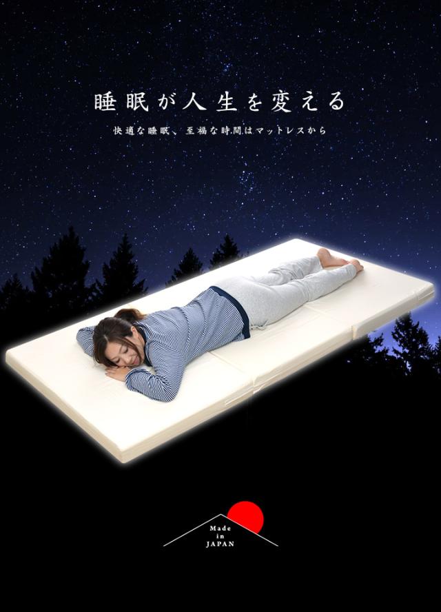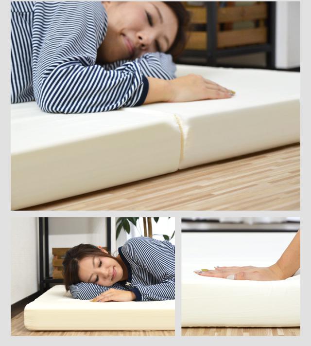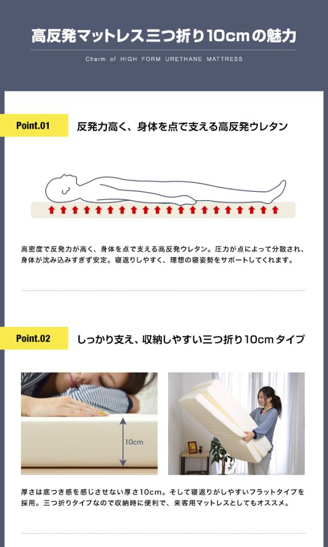 厚さは底つき感を感じさせない厚さ10cm。そして寝返りがしやすいフラットタイプを採用。三つ折りタイプなので収納時に便利で、来客用マットレスとしてもオススメ。