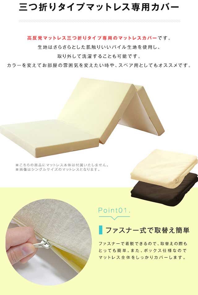 | 特記事項 | ※こちらの商品は高反発マットレス三つ折りタイプ 厚さ10cm専用のカバーとなります。 ※カバーのみの販売となります。マットレス本体は付属いたしません。 ※旧製品の底面には、ノンスリップ加工仕様のものがございます。ノンスリップ加工のディンプルは、PVC(ポリ塩化ビニル)を使用しており、材質の特性上、接触・摩擦による他製品への色移り、または本商品への色移りすることがありますので、ご注意ください。 |
