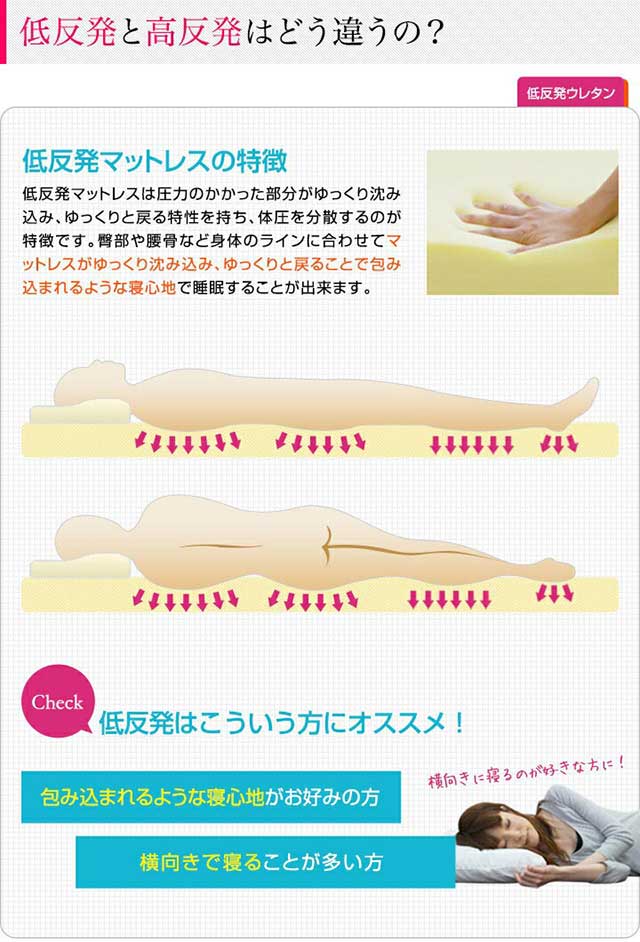 高反発マットレスは下からの跳ね返りの力により、沈み込みが少ないのが特徴です。その為、寝返りがうちやすく就寝時の身体の一部分(首・肩・腰・足)にかかる体圧も分散。寝返りが多い方や仰向けに寝ることが多い方にオススメなマットレスです。