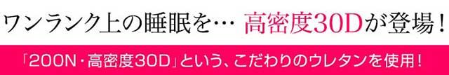 高反発マットレスは変形しても元の形に戻りやすい復元力、へたりにくい特徴があります。そんな高反発マットレスのウレタンフォームの密度を上げた高密度30Dタイプの登場です。この密度を上げることで、耐久性が高くなり、しっかりと支えてくれるので寝心地にも変化。ウレタンフォームの硬さも、しっかりとした弾力で硬めの200Nで身体全体を支えてくれます。ぜひ、このこだわった高密度30D・硬めの200Nのマットレスをご堪能ください。
