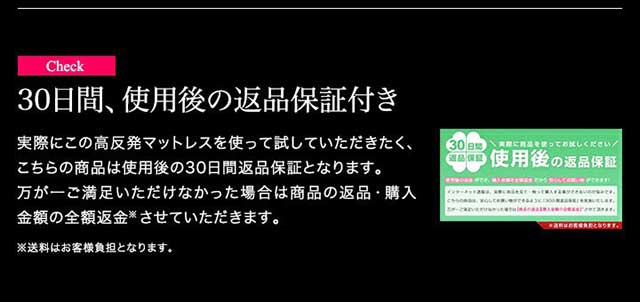 実際にこの高反発マットレスを使って試していただきたく、こちらの商品は使用後の30日間返品保証となります。万が一ご満足いただけなかった場合は商品の返品・購入金額の全額返金させていただきます。