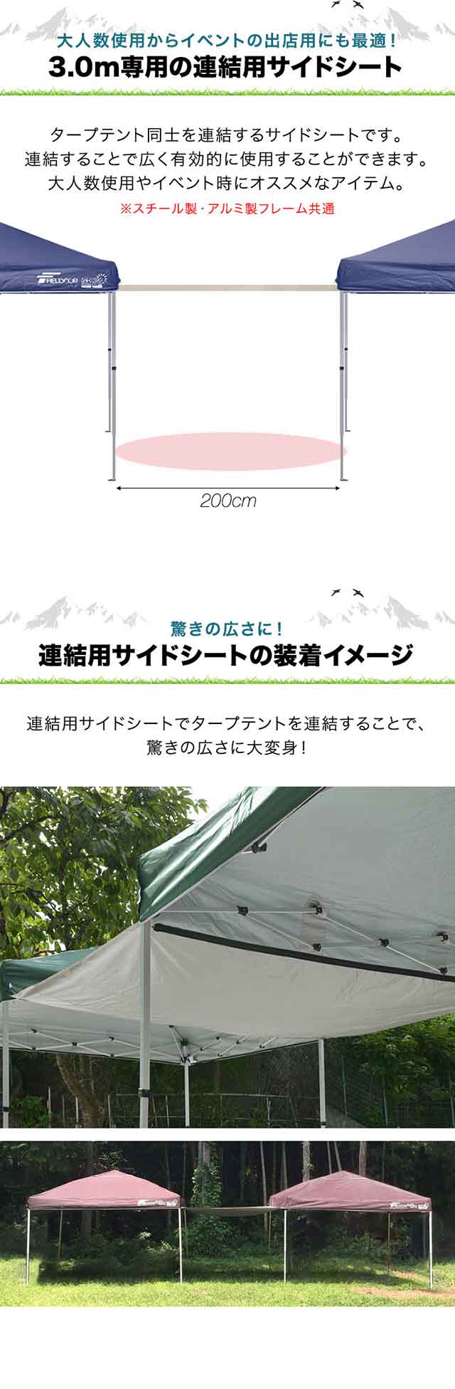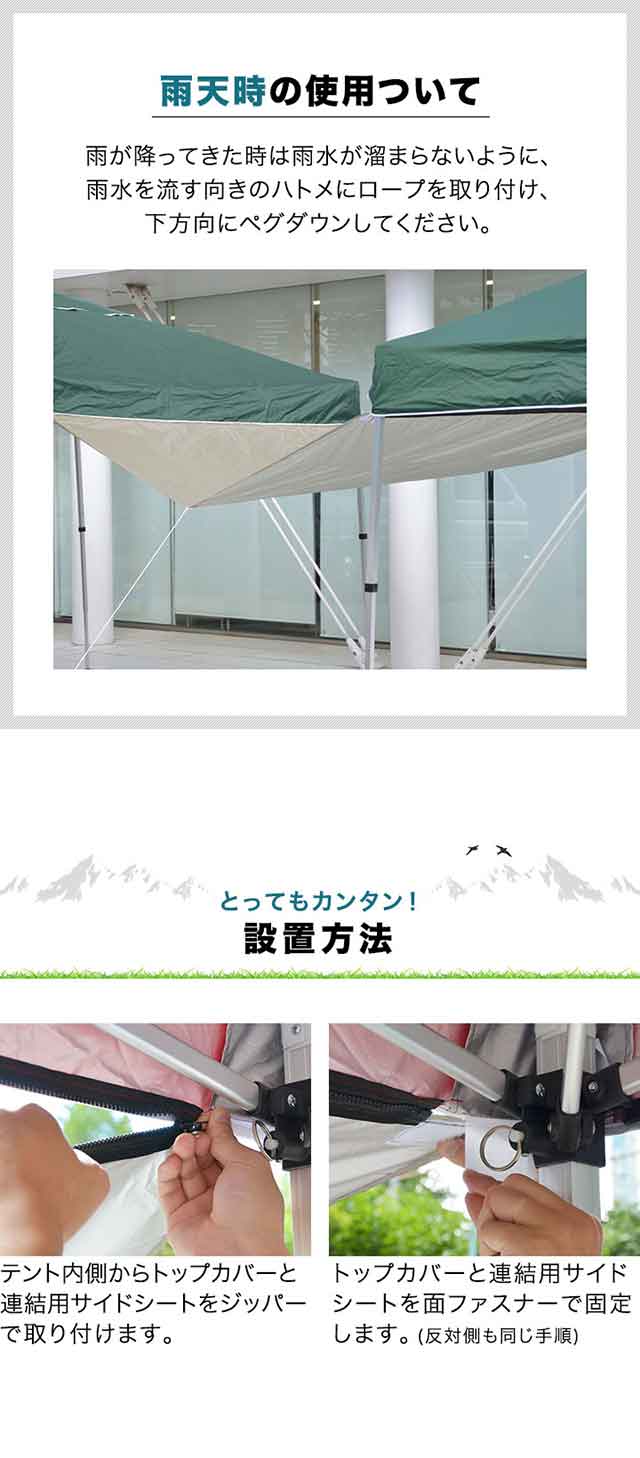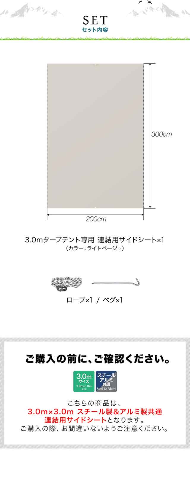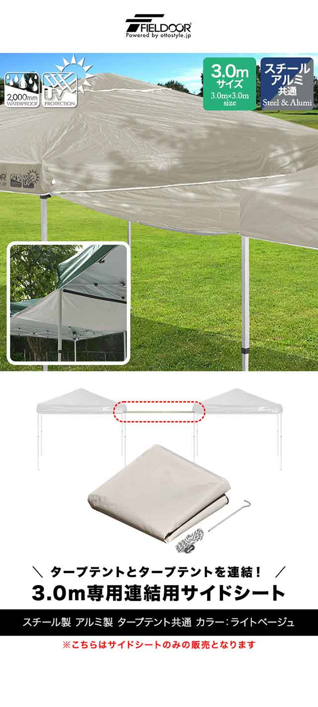 | 付属品: ・3.0mタープテント連結用サイドシート×1枚 ・ロープ×1本 ・ペグ×1本 |
