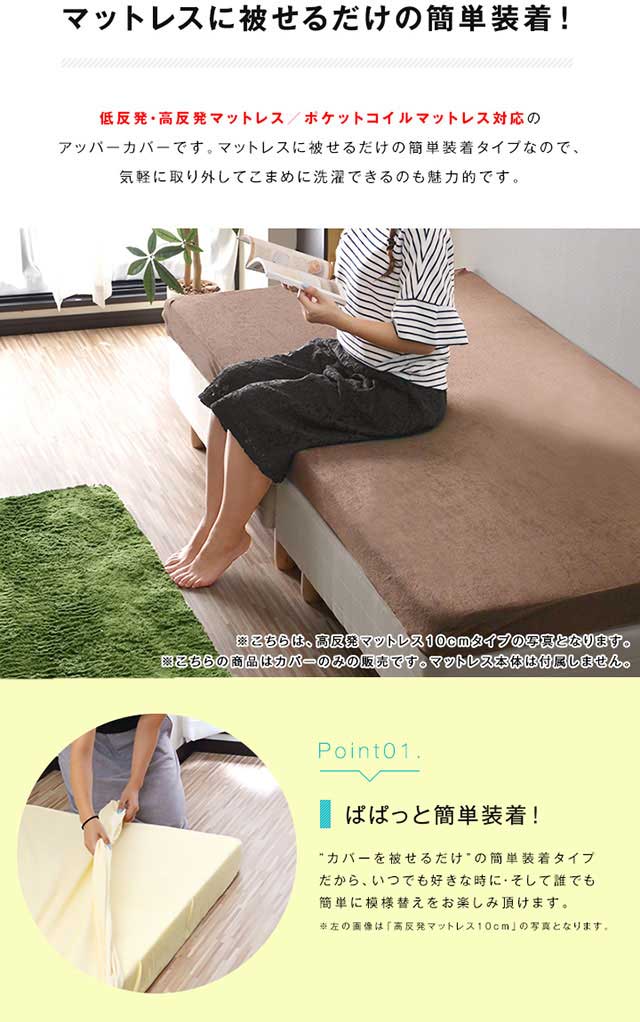 | 特記事項 | ※こちらの商品は低反発・高反発マットレス/ポケットコイルマットレス専用のアッパーカバーとなります。 ※カバーのみの販売となります。マットレス本体は付属いたしません。 | |