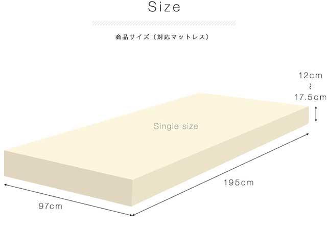 | サイズ | (約)幅97cm×長さ195cm×厚さ12cm〜17.5cm×折返し15cm シングルサイズ用 | |