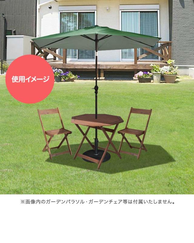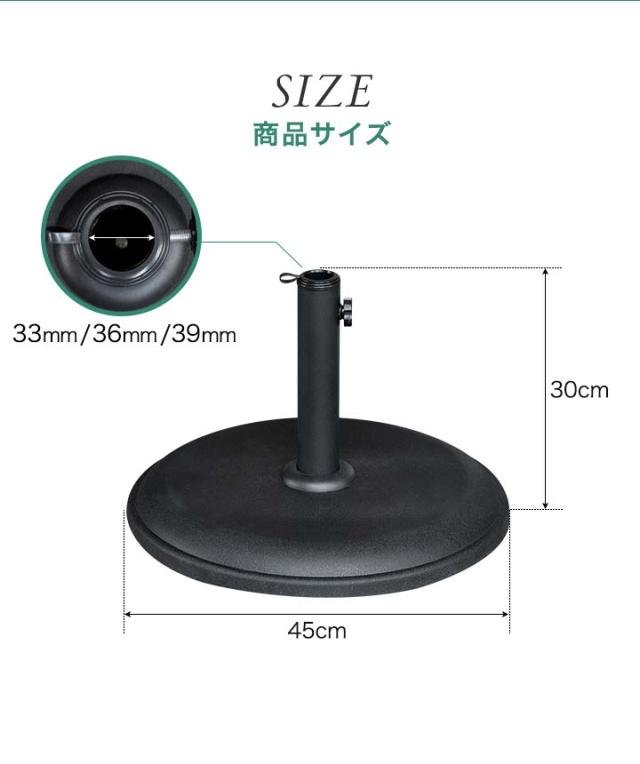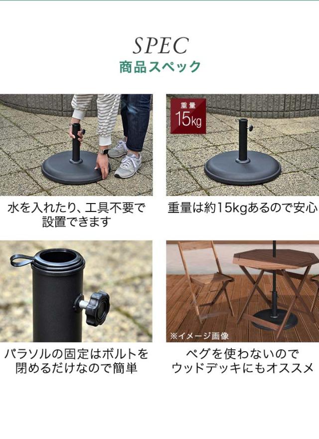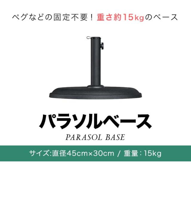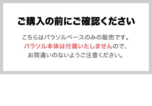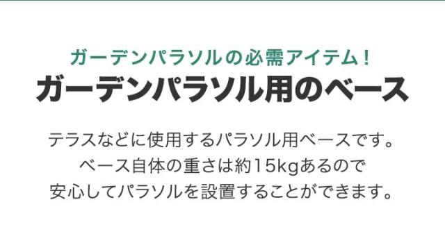 | 特記事項: ※本商品はパラソルベースのみの販売となります。パラソル本体・ガーデンテーブルセット等は付属いたしません。 ※風が強い日は危険ですので、絶対に使用しないでください。使用中に天候が悪化した場合は、直ちに使用を中断し撤収してください。 ※パラソルから長時間離れる場合は必ず収納してください。常設でのご使用はおやめください。 ※パラソルは平坦で水はけが良く、障害物のない風の弱い安全な場所に設置してください。 |