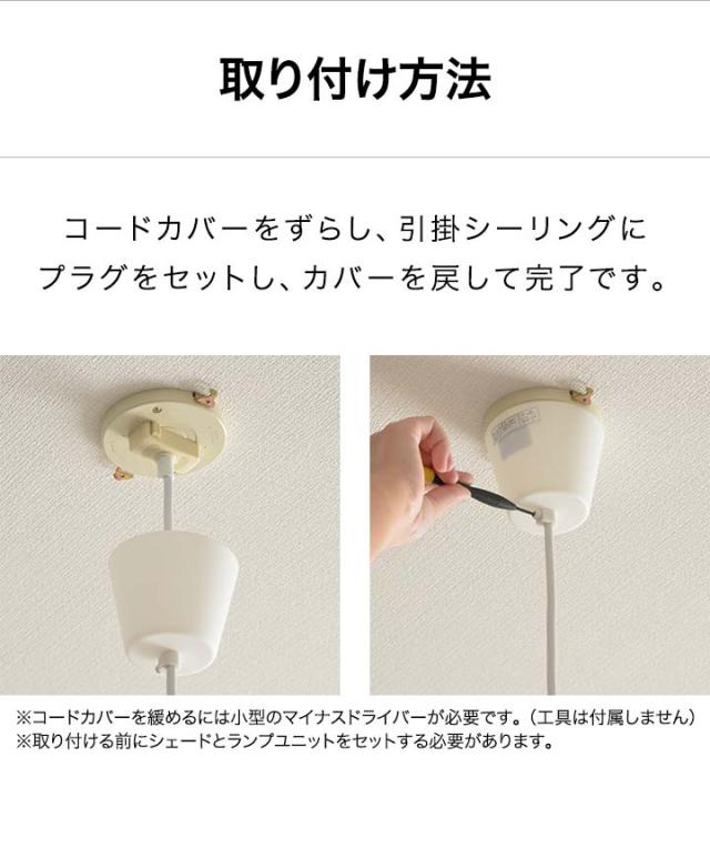 | 特記事項: 【工具について】 コードカバーを緩める小型マイナスドライバーが必要です。(工具は付属いたしません) 【お手入れ方法】 シェードは取り外して丸洗いできます。薄めた中性洗剤で軽く洗い、水洗いして、形を整えてから陰干ししてください。(通常はほこりを払うだけで充分です) 【点灯方法】 本商品にはスイッチ紐等がなく、電気のON/OFFは壁のスイッチで行う仕様です。壁のスイッチがない場合はON/OFF操作はできませんのでご注意ください。 |