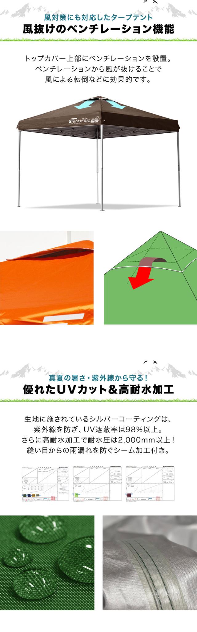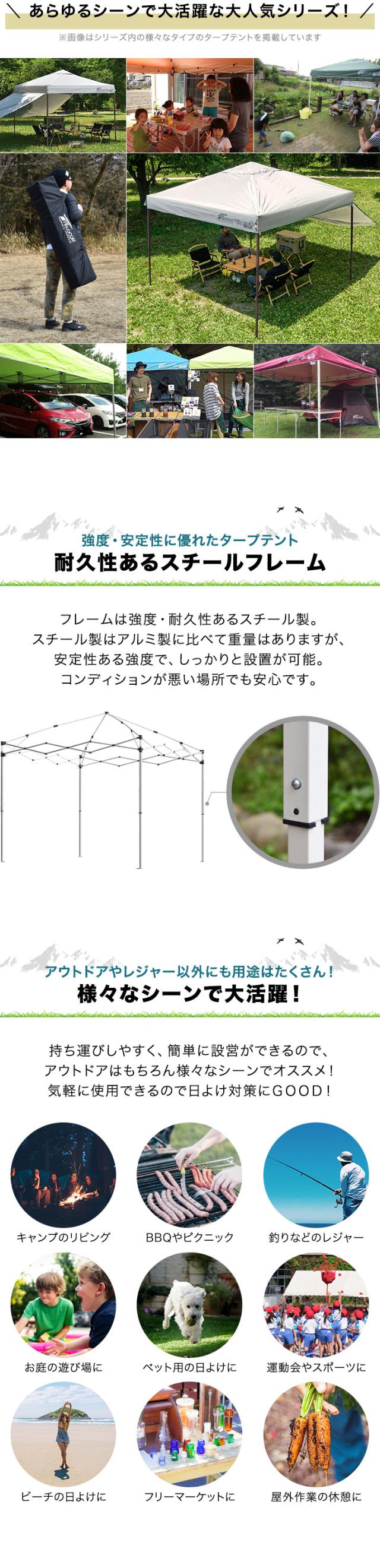 タープテントは抜群の日よけ効果があり、快適な日陰を作ることができます。トップカバー上部には、風抜けのベンチレーションを装備。テント内側にたまる空気が通り抜け、風によるタープテントが倒れる事故にも効果的。アウトドアに留まらず、スポーツ大会やイベント等にもピッタリなアイテムです。