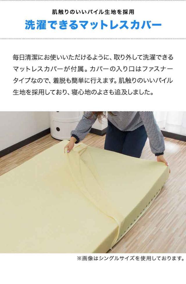 | 特記事項: ※圧縮梱包されたままの状態で長期間保管した場合、マットレスが復元できなくなってしまいます。商品到着後、1週間以内に必ず圧縮から開放をして頂くようにお願いします。 ※製品の臭いが気になりましたら、風通しの良いところで脱臭してください。この臭いは素材のウレタンによるもので無害です。臭いに敏感な方は十分ご検討の上、ご購入をお願いいたします。 ※マットの硬さは温度によって変わってきます。また、硬さの感じ方には個人差があります。 ※カバーは取り外して洗濯ができますが、マットレス本体は洗濯しないでください。 |