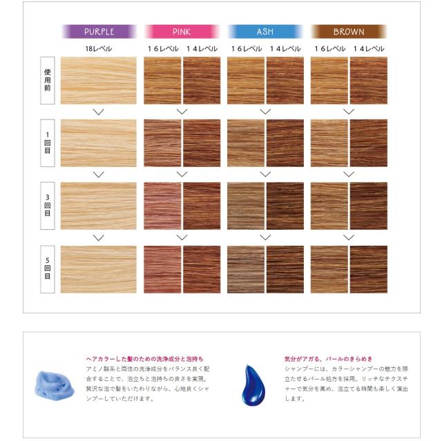 シャンプーには、カラーシャンプーの魅力を際立たせるパール処方を採用。リッチなテクスチャーで気分を高め、泡立てる時間も楽しく演出します。