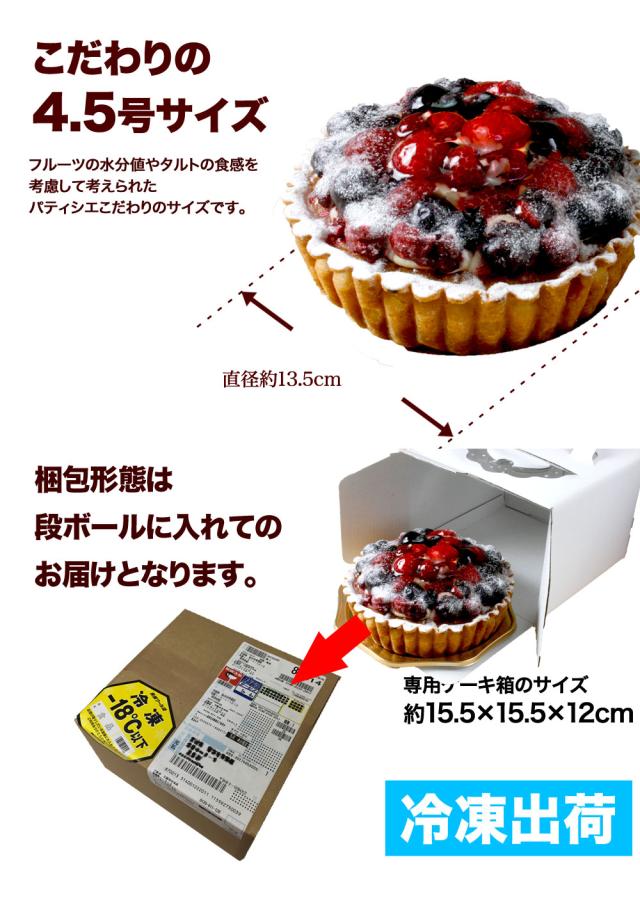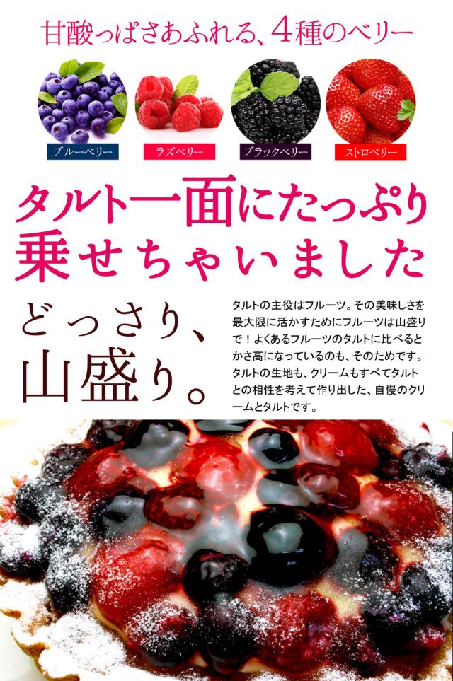 サクサクのタルトの上には4つのベリーがたっぷり♪ラズベリー、ブルーベリー、ブラックベリー、ストロベリーが思わず驚くほど豪華な山盛りフルーツ。見た目にもお口にも美味しく、おもてなしのケーキにもピッタリ!大人気の山盛りフルーツタルトシリーズ!