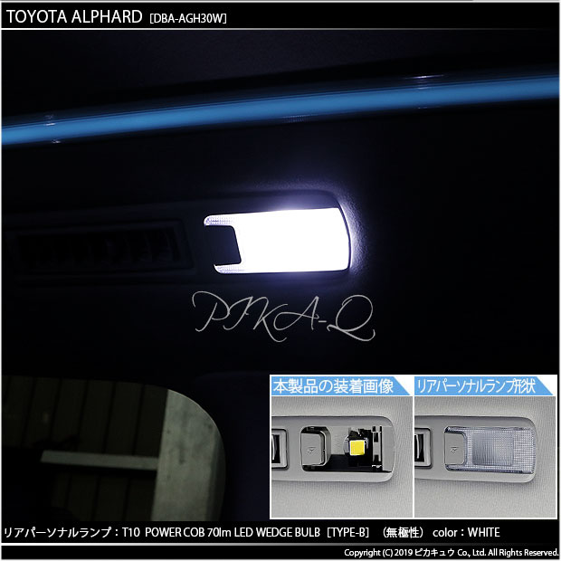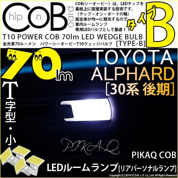 | トヨタ アルファード[30系 後期](AGH30W/GGH35W/AGH35W/GGH30W)対応 リアパーソナルランプ用LEDバルブ T10 POWER COB 70ルーメン LEDウェッジバルブ [タイプB] 形状:T字型-小 LEDカラー:ホワイト 1セット4個入り | ||||