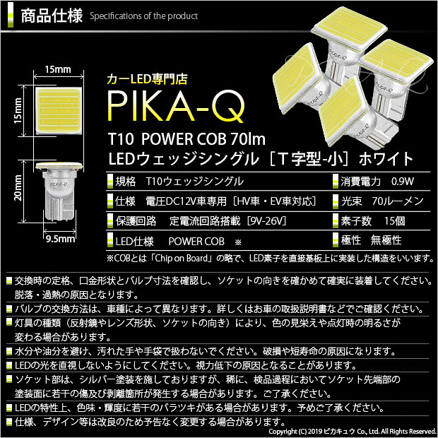 | サイズ | COBサイズ:15mm×15mm/COB最大直径:21mm/高さ:20mm/ソケット幅:9.5mm ※T10白熱球サイズ 全長:27mm/最大直径:10mm/幅:9.5mm | |||