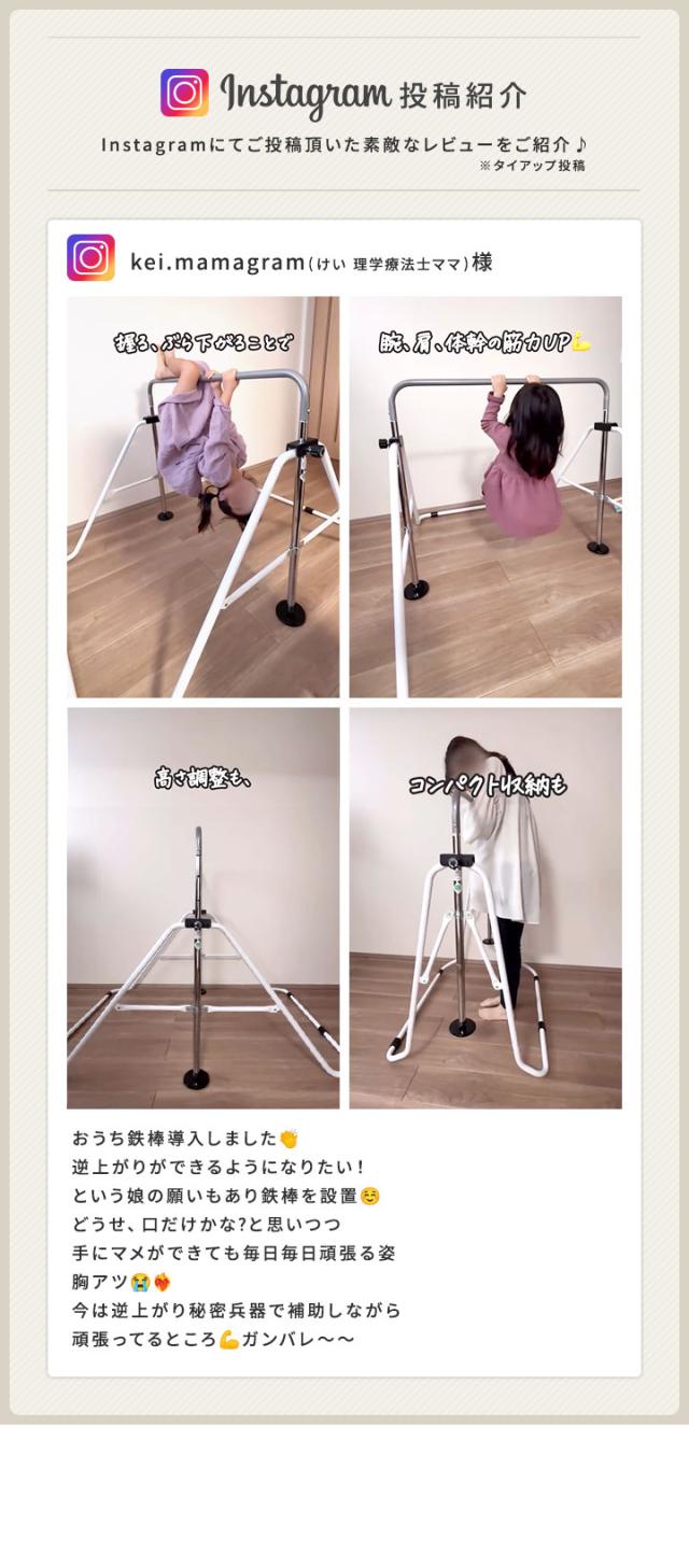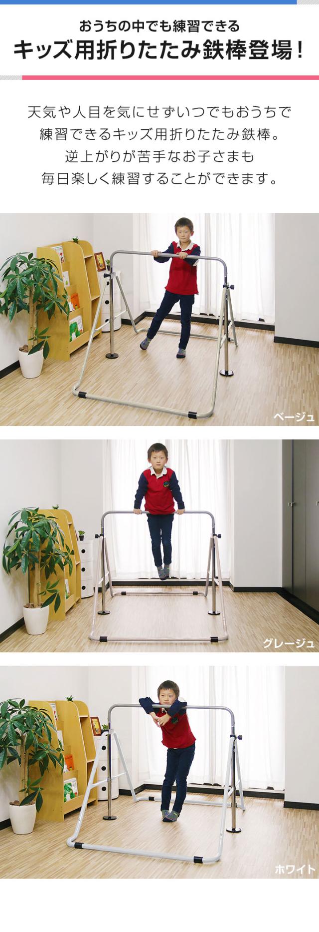 天気や人目を気にせずいつでもおうちで練習できるキッズ用折りたたみ鉄棒。逆上がりが苦手なお子さまも毎日楽しく練習することができます。