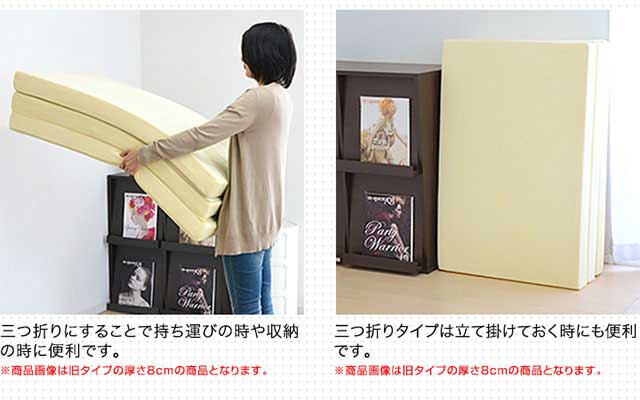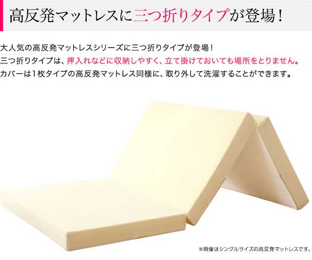 大人気の高反発マットレスシリーズに三つ折りタイプが登場!三つ折りタイプは、押入れなどに収納しやすく、立て掛けておいても場所をとりません。カバーは1枚タイプの高反発マットレス同様に、取り外して洗濯することができます。
