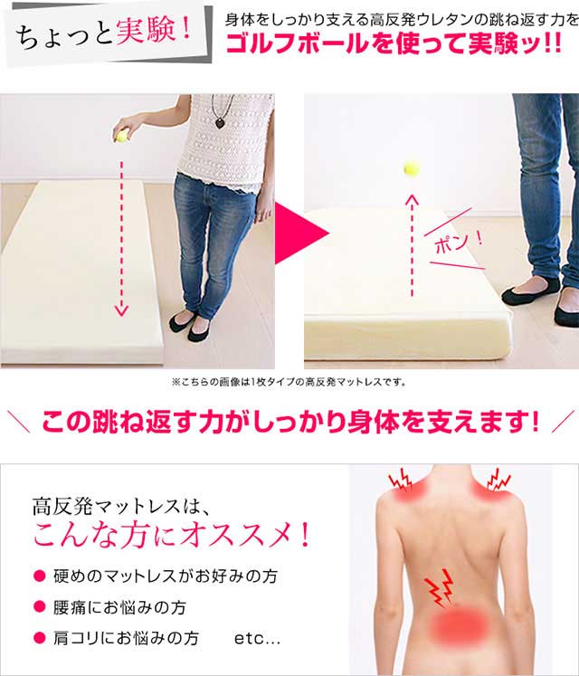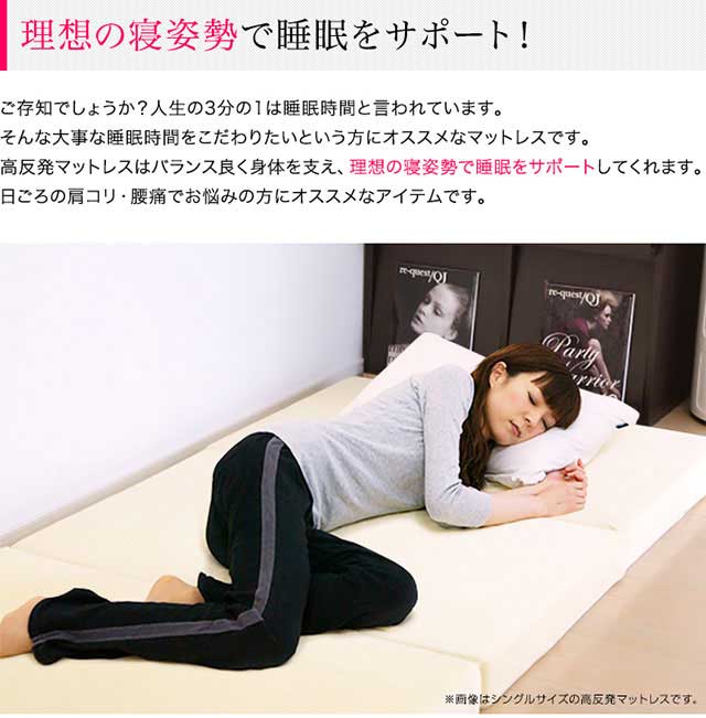 | 身体をしっかり支え、理想の寝姿勢をキープ!弾性の高いウレタンフォームで身体をサポート! 高反発マットレス(密度27D/硬さ150N・180N) 三つ折りタイプ 10cm ダブルサイズ [2カラー] |