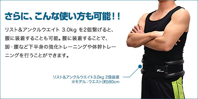 リスト&アンクルウエイトを複数個繋げると腰に装着することも可能。腰に装着することで、脚・腰など下半身の強化トレーニングや体幹トレーニングを行うことができます。※商品は2個セットでの販売となります。