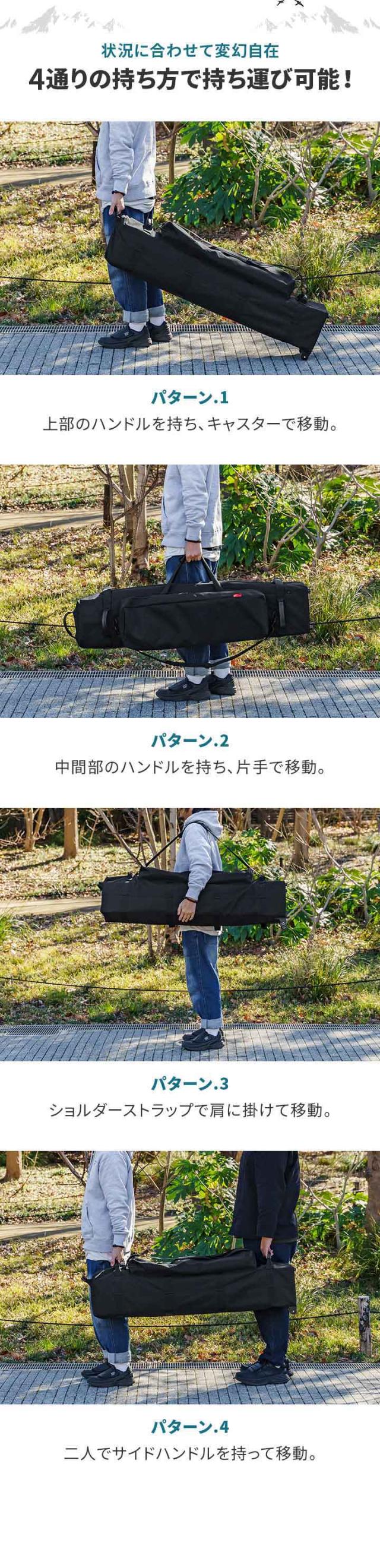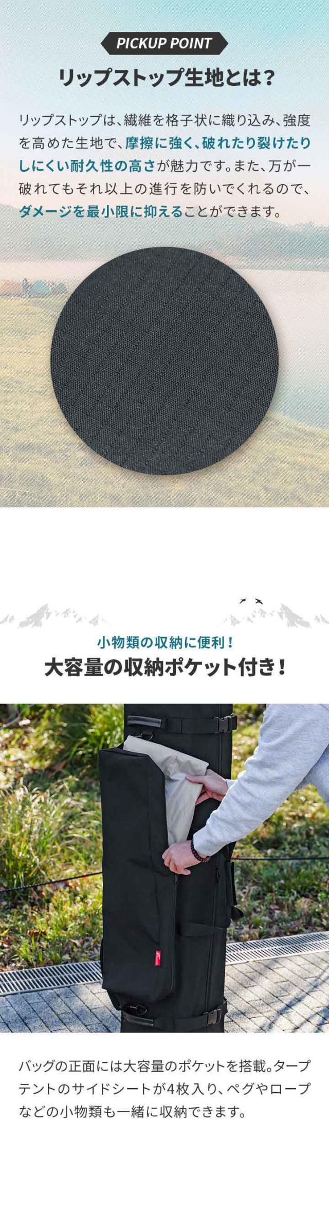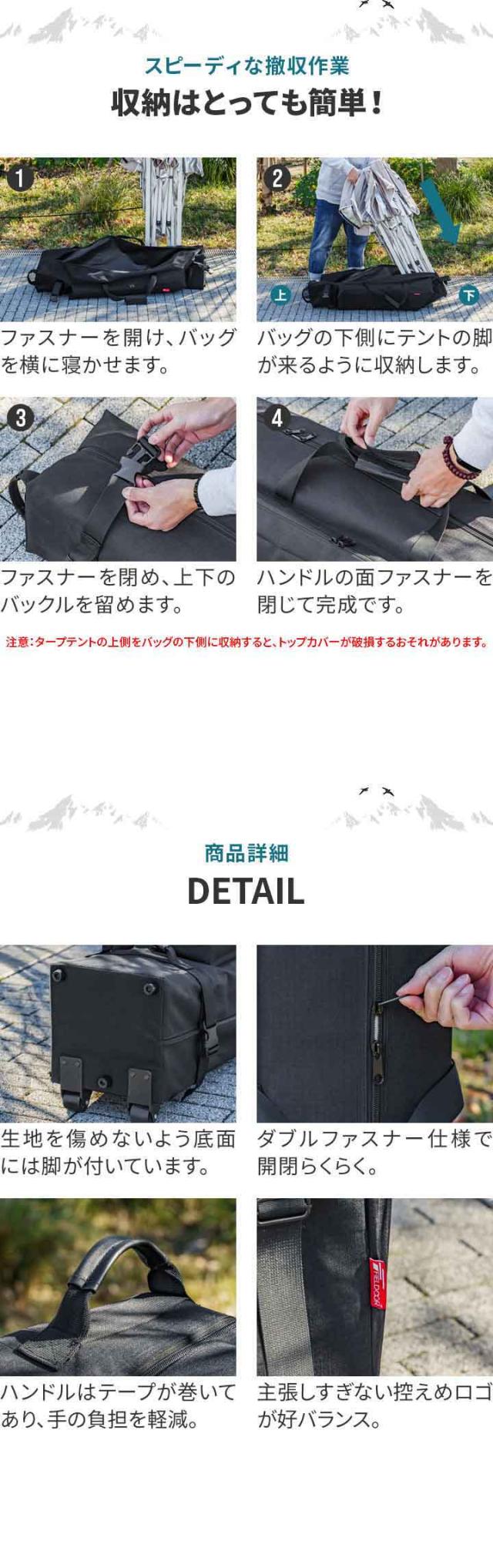 | 特記事項: ※旧タイプの【スチール製 高さ調節3段式】のタープテントにはご使用できませんのでご注意ください。 ※タープテントの上面をバッグの下側に収納すると、トップカバーが破損するおそれがあります。 |