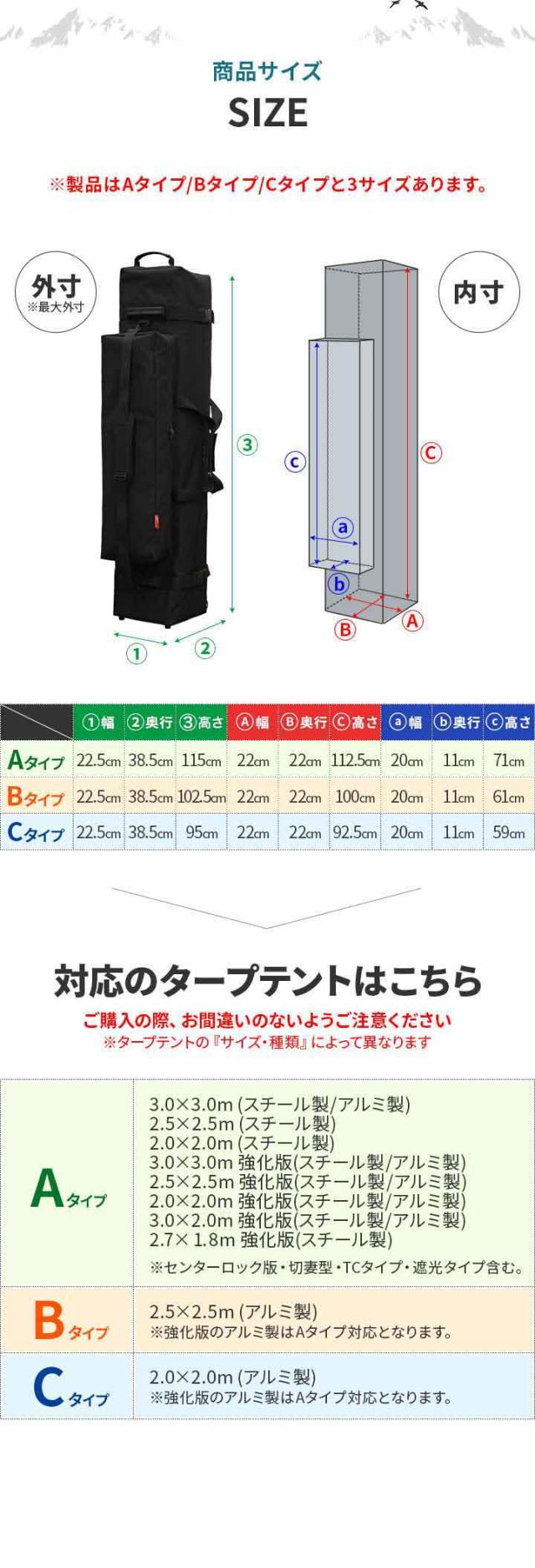 | 対応タープテント: 【Aタイプ】 ・3.0×3.0m (スチール製/アルミ製) ・2.5×2.5m (スチール製) ・2.0×2.0m (スチール製) ・3.0×3.0m 強化版 (スチール製/アルミ製) ・2.5×2.5m 強化版 (スチール製/アルミ製) ・2.0×2.0m 強化版 (スチール製/アルミ製) ・3.0×2.0m 強化版 (スチール製/アルミ製) ・2.7×1.8m 強化版 (スチール製) ※センターロック版・切妻型・TCタイプ・遮光タイプも含む。 【Bタイプ】 ・2.5×2.5m (アルミ製) ※強化版はAタイプ対応となります。 【Cタイプ】 ・2.0×2.0m (アルミ製) ※強化版はAタイプ対応となります。 他社メーカーの製品: ・タンスのゲン : ENDLESS BASE 3.0×3.0m、2.0×2.0mなど ・ロゴス : Qセットタープ ・コールマン : インスタントバイザーシェード ※タンスのゲンはタンスのゲン株式会社の登録商標です。 ※ロゴスは株式会社ロゴスコーポレーションの登録商標です。 ※コールマンはザコールマンカンパニーインコーポレイテッドの登録商標です。 注意 : 他社メーカー製品の収納サイズについてはお客様自身で計測の上、最適のサイズをご購入ください。また、各社、製造時期で収納サイズが異なる場合がありますので、ご注意ください。 |